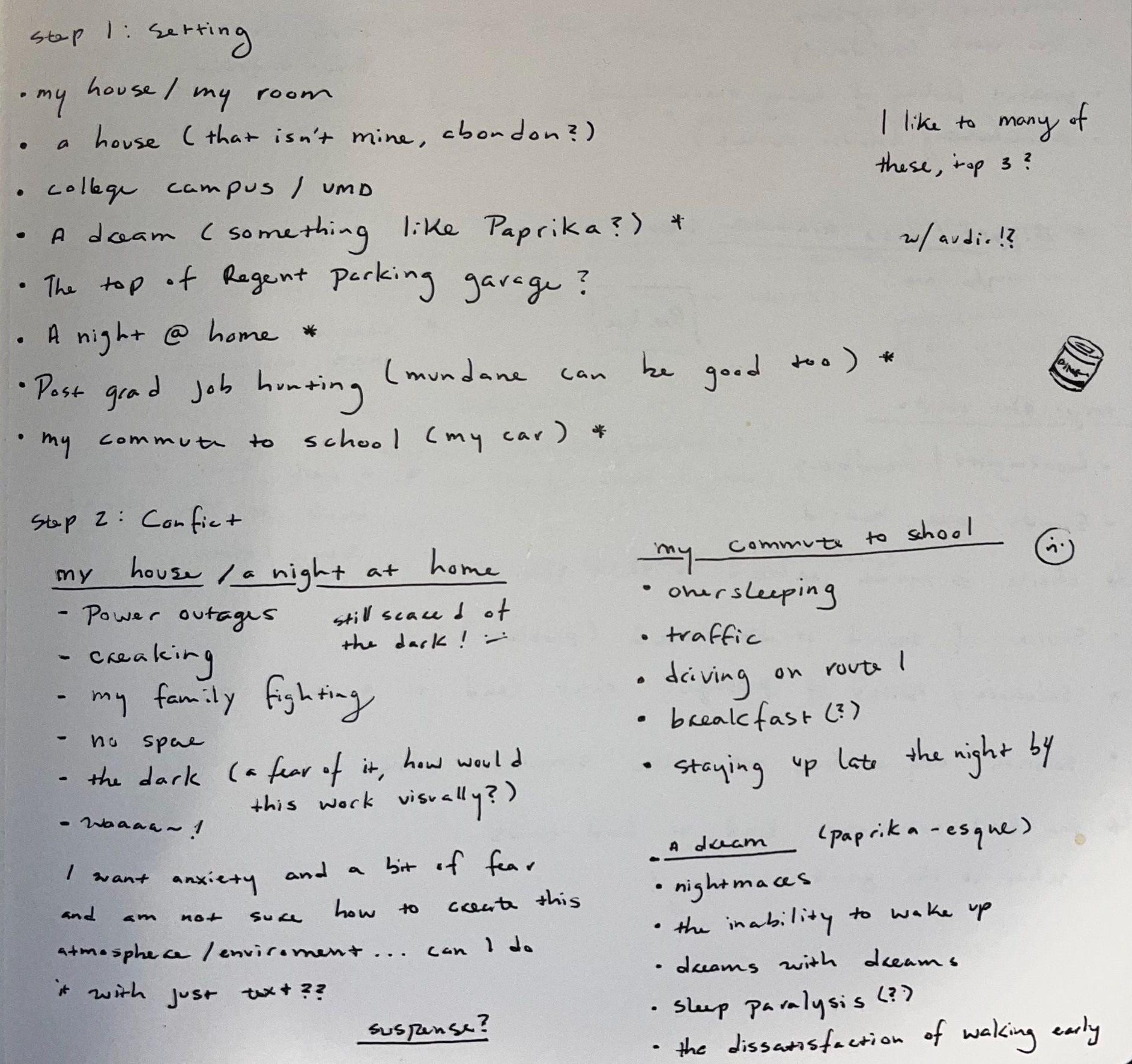 Notes helped clarify the themes, tone, and major emotional beats. Early ideas were centered on fear, curiosity, and the mundane.
