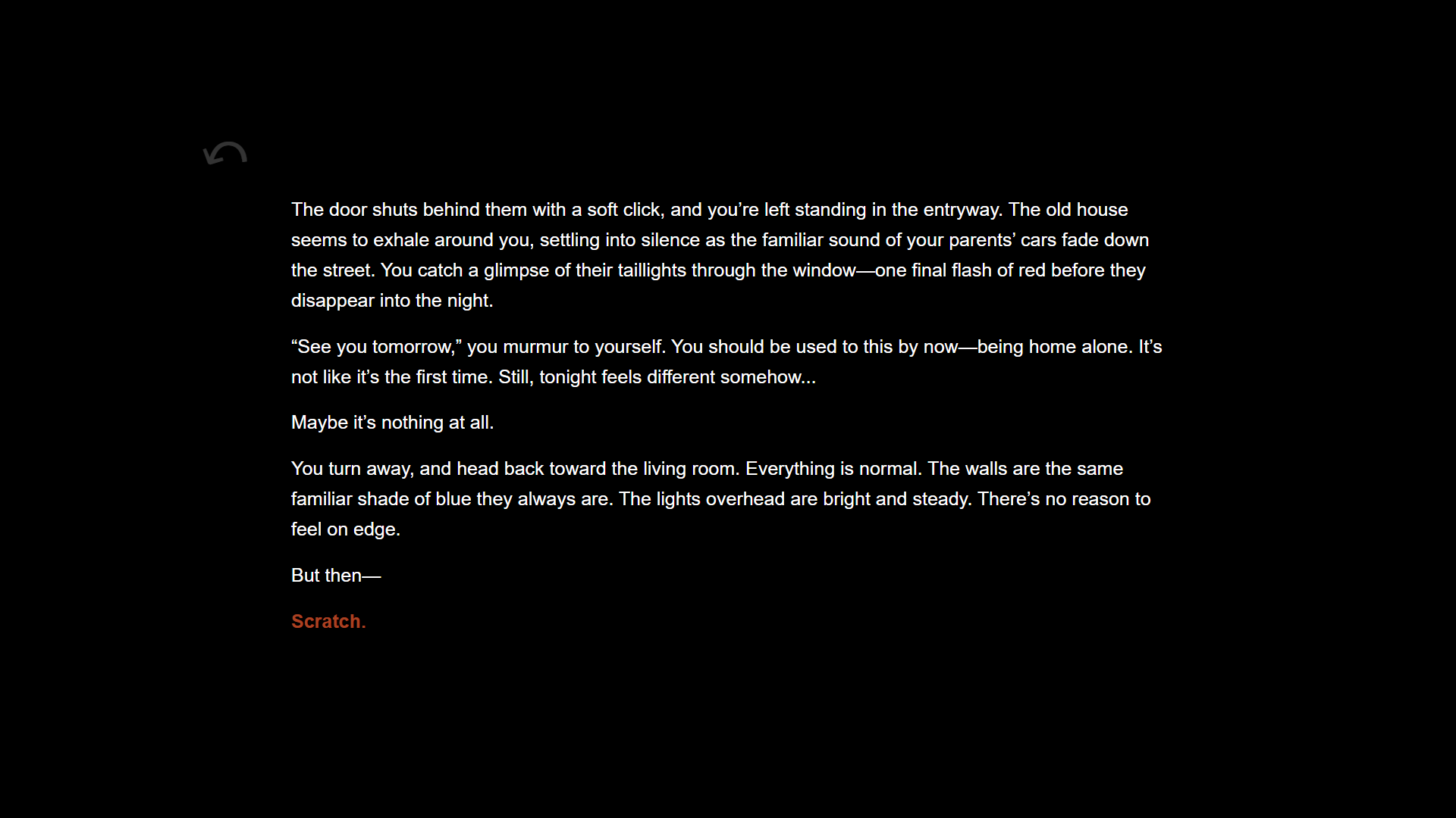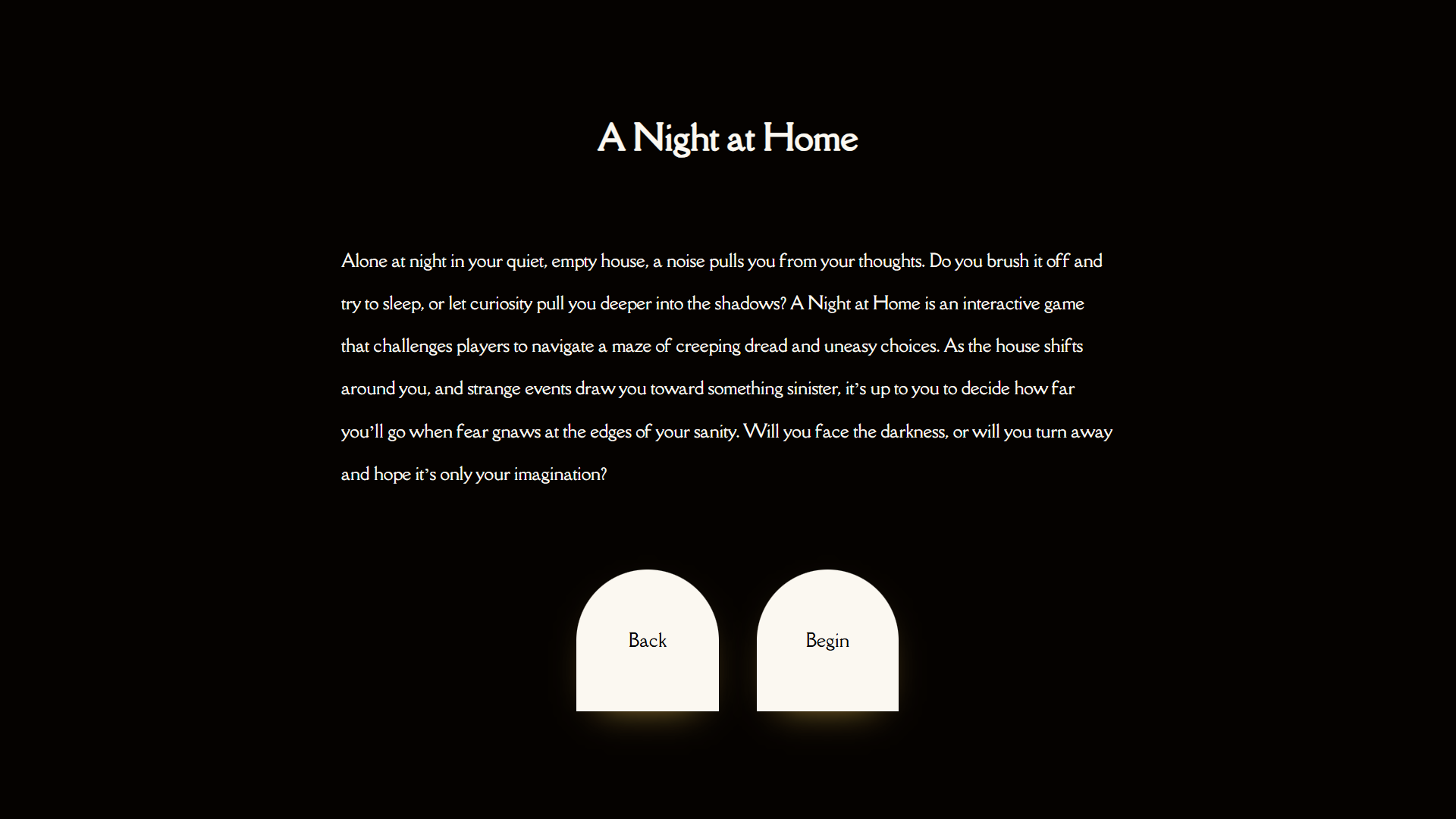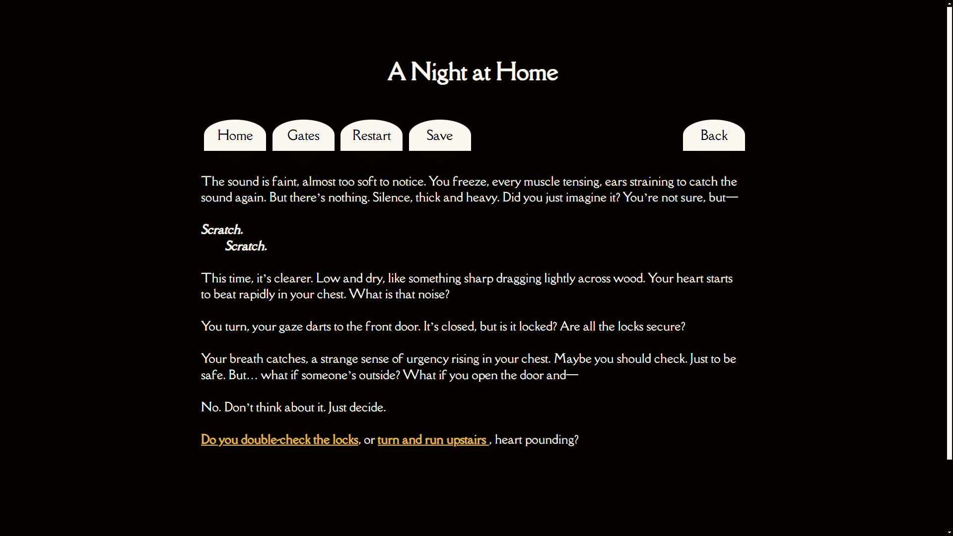Developed over 2 months (November–December 2024), A Night at Home is a branching narrative horror game where players decisions shape the story, blending interactive fiction with subtle atmospheric horror.